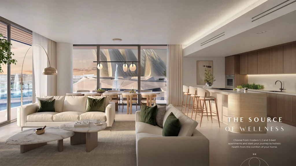 The Source Saadiyat Grove offers a selection of luxury apartments featuring spacious layouts, private balconies, premium finishes, and modern interiors. The residences are designed to complement wellness-focused living in a serene island environment.