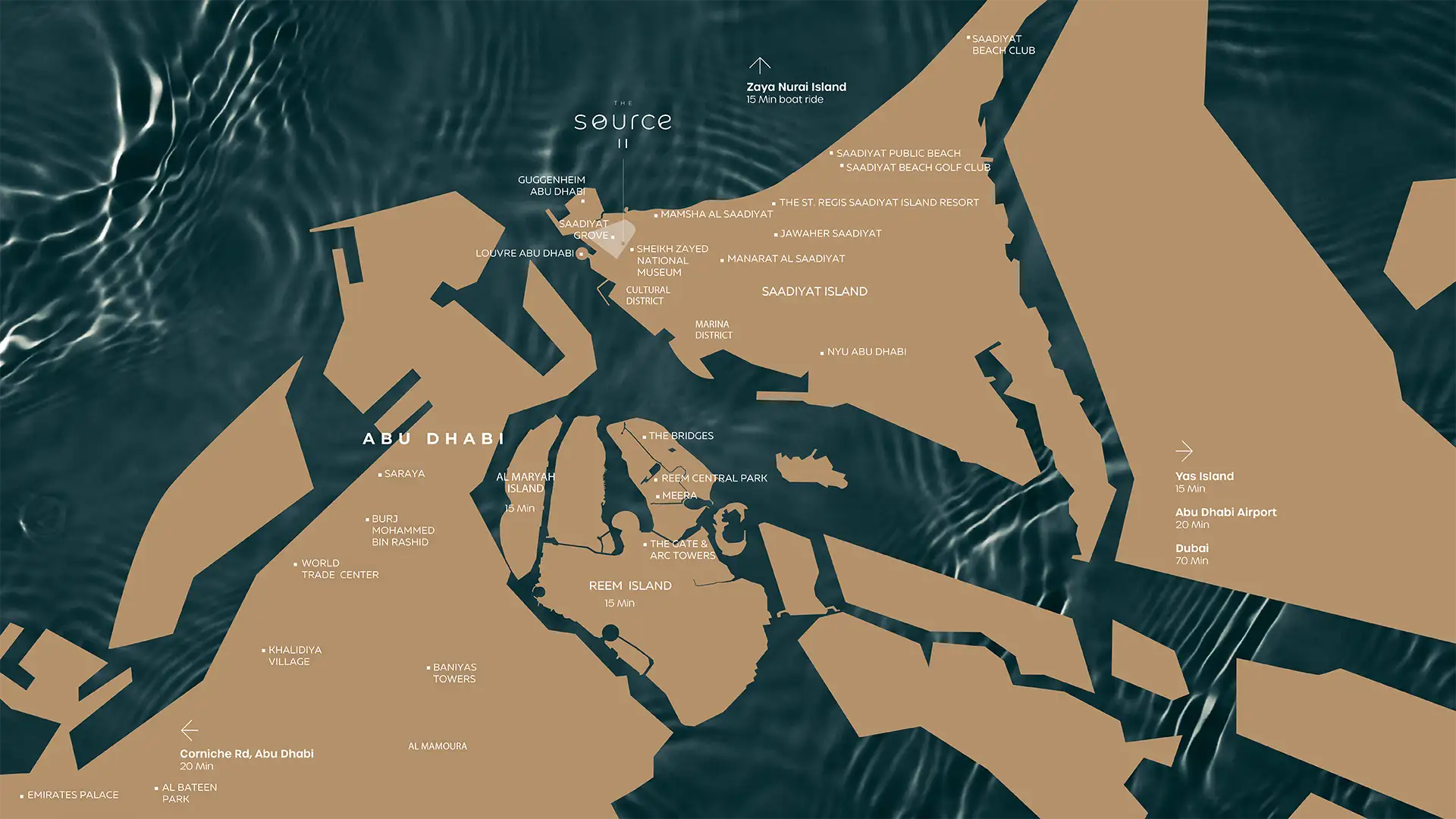 The Source II at Saadiyat Grove is situated within the Saadiyat Cultural District, offering residents seamless connectivity to Abu Dhabi’s most iconic landmarks. With close proximity to the Louvre Abu Dhabi, Zayed National Museum, and major arterial roads, the development ensures effortless access to the city center, key business hubs, and premium lifestyle destinations—while preserving the serenity of refined island living.